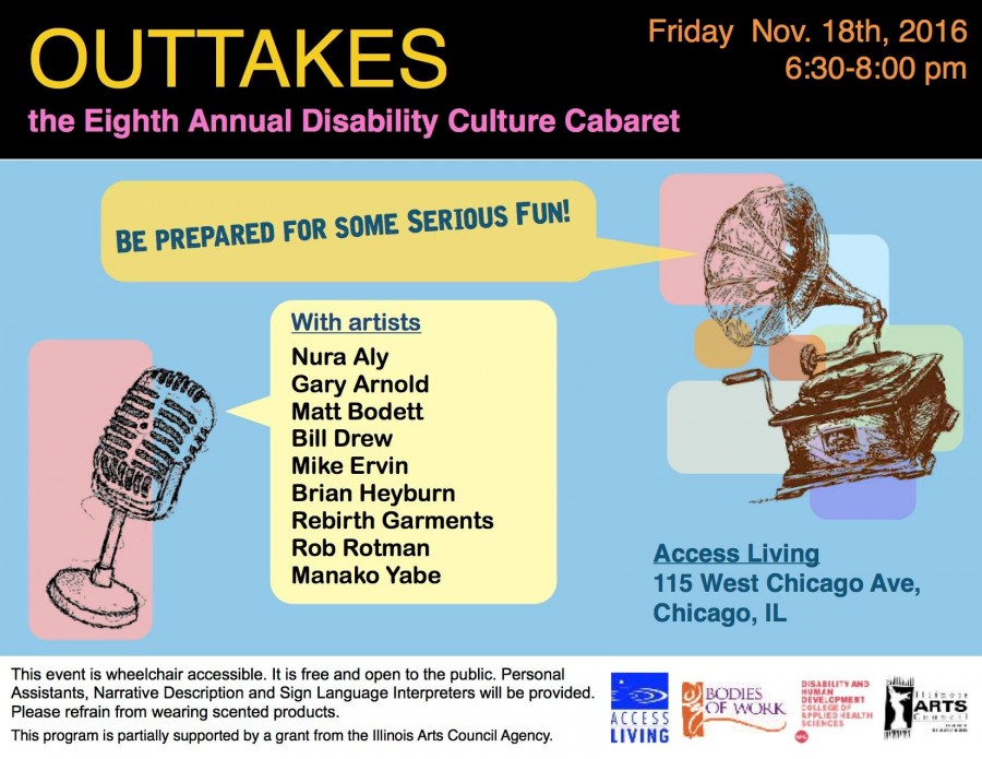 Tags: Access Living, Bill Drew, Brian Heyburn, Chicago, Gary Arnold, Manako Yabe, Matt Bodett, Mike Ervin, Near North, Nura Aly, Outtakes The Eighth Annual Disability Culture Cabaret, Rebirth Garments, Rob Rotman
