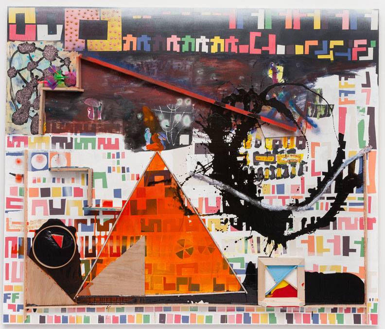 You could fixate on the range of media in her paintings. You could fixate on the use of sewing. You could fixate on the collage element. You could fixate on the annihilation of a distinction between abstract and figurative imagery. You could fixate on the technique of staining, the relationship to drawing, actual drawings, the avoidance of pattern, an intrusion of pattern, the drawbridge between raucous humor and arch seriousness. You could fixate on fixation. Or on the avoidance of fixation, the move between one position and another.