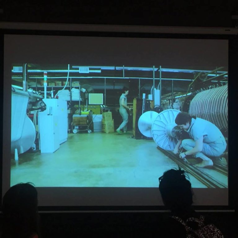 Floorplan documents the machines, processes and physical environment of The Weaving Mill. Shot over the course of a weekend, the video focuses on the mechanics, sounds and human interfaces of the textile machinery. The companion fabric is a material manifestation of the processes documented in the video, bringing an artifact of the factory into the gallery.