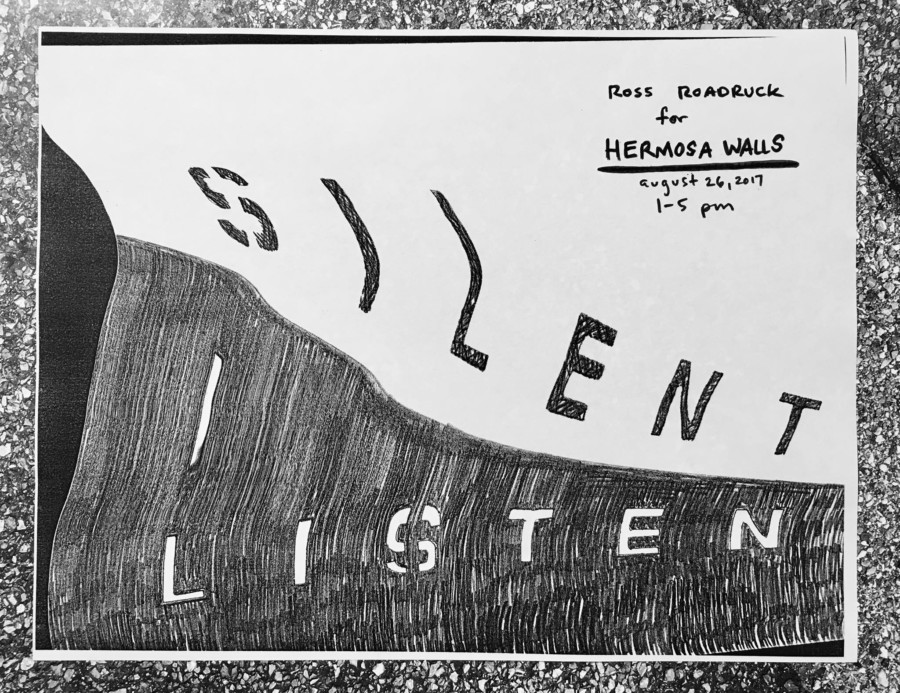 Come check out the unvieling of Ross Roadruck mural at The Hermosa Walls. Tight patterns of black and white silent/listen will cover the walls. Come check it out and leave with your own personal silent/listen screen prints!!