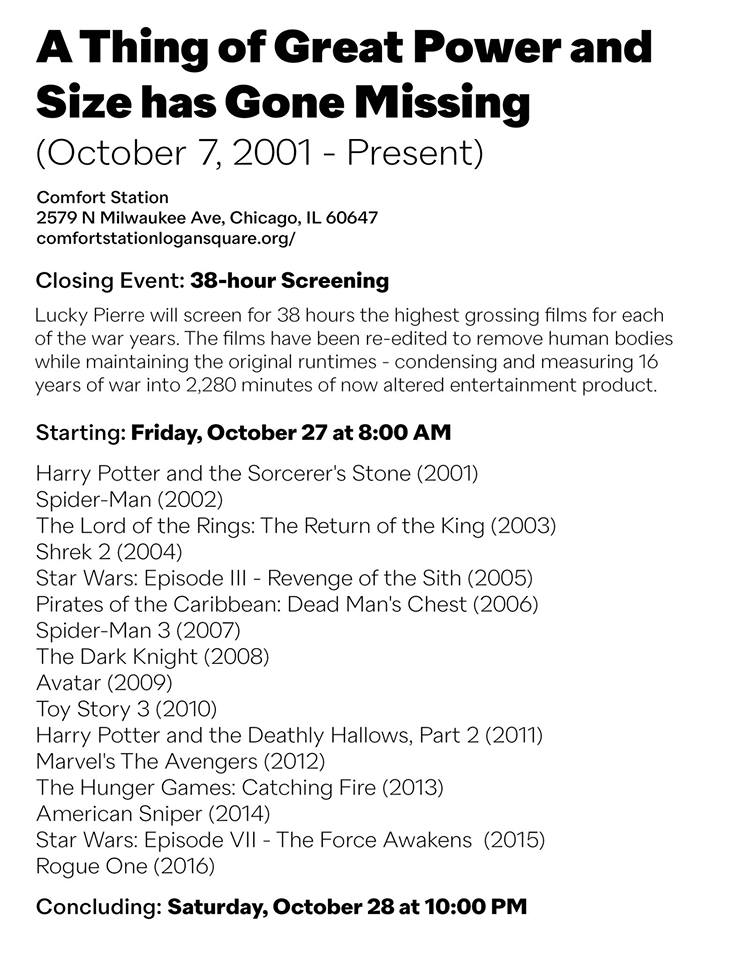 Lucky Pierre will screen for 38 hours the highest grossing films for each of the war years. The films have been re-edited to remove human bodies while maintaining the original runtimes – condensing and measuring 16 years of war into 2,280 minutes of now altered entertainment product.