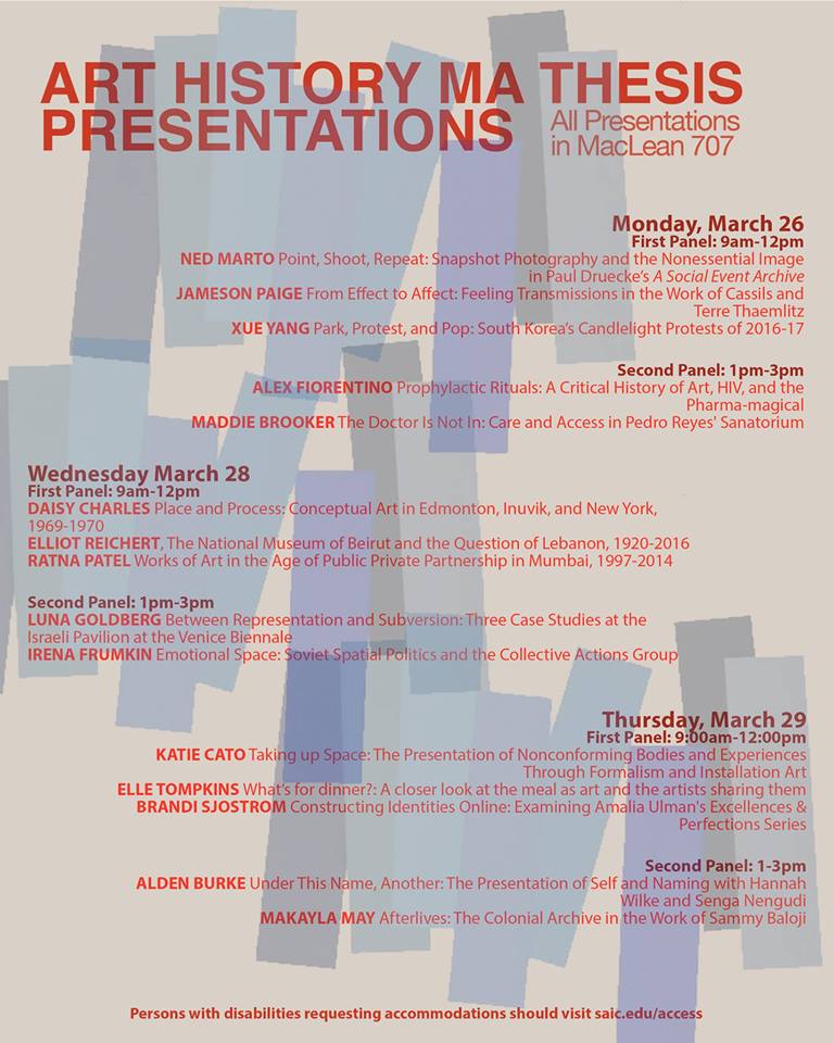 Please join us for thesis presentations by candidates for the Masters in Art History, Theory, and Criticism, and Dual Art History/Arts Administration degrees. The presentations will take place in MacLean 707 on Monday, March 26th, Wednesday March 28th, and Thursday, March 29th. All are welcome.