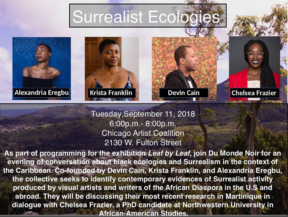 Tags: Alexandria Eregbu, Chelsea Frazier, Chicago, Chicago Artists' Coalition, Devin Cain, Du Monde Noir, Illinois, India Martin, Krista Franklin, Leaf by Leaf, near west side, Sabrina E. Greig, Surrealist Ecologies, Whit Forrester, Yasmin Spiro