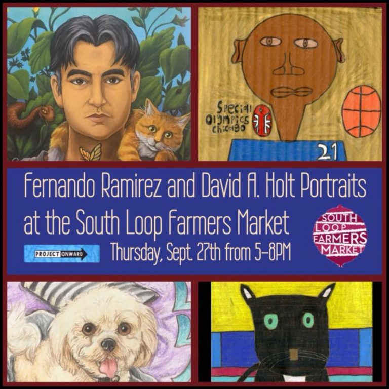 Fernando Ramirez and David A. Holt of Project Onward will be set up at the South Loop Farmers Market to do portraits of people or pets for $30! Kick off the Fall season with a portrait in the unique style of these talented artists!
