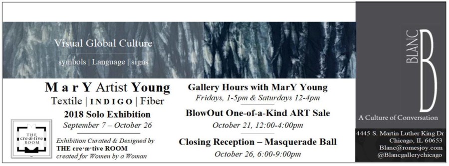 MarY Young | MY re-established her Studio Practice as the Inaugural 2015-16 Master Residency Artist at THE cre.æ.tive ROOM, building a new body of work, the “Indigo Shibori Textile – Symbolic Language” series. Additional Residencies include Hyde Park Art Center – Teaching Artist Residency (2018) and The School of the Art Institute – Oxbow Program (2017). Exhibitions include galleries in Michigan City, IN (Southern Shore Art Association), Chicago, IL (South Side Community Art Center), Glen Echo, MD (Glen Echo Gallery) and Washington, DC (Mary Mc Cloud Bethune Museum). Awards include Study-Abroad Program to Italy, an International Artist Exchange Program to Australia and a summer Artist-Residency with the Department of Interior, Parks & Recreation. MY textiles are in private collections in Washington, DC, San Francisco, CA and Chicago, IL.