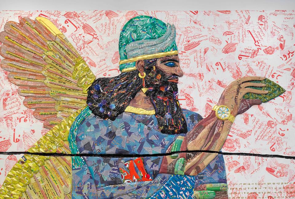 Unlike the three millennia old stone, the artist’s chosen materials are contemporary Middle Eastern newspapers and packaging from northern Iraqi foods like date cookies and date syrup. For Michael Rakowitz, the salvage of these vulnerable materials speaks to the human, economic, and ecological catastrophes wrought by the Iraq War and its aftermath. The vibrant color scheme references archaeologists’ understanding of the original appearance of the panels. Room Z is the latest chapter in Michael Rakowitz’s project The Invisible Enemy Should Not Exist, which aims to reconstitute the artifacts stolen from the National Museum of Iraq in the aftermath of the US invasion in 2003 and the continued desire to destroy Mesopotamian cultural heritage. Since 2007, Michael Rakowitz has reconstructed more than 700 monuments and artifacts, most prominently a majestic Lamassu destroyed by ISIS in Nineveh, which currently stands in London’s Trafalgar Square as the Mayor of London’s Fourth Plinth commission (2018-2020).