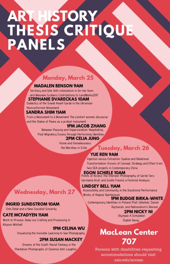 Please join the Department of Modern and Contemporary Art History, Criticism & Theory for three days of MA candidate thesis critique panels, in conjunction with SAIC’s annual Critique Week.
