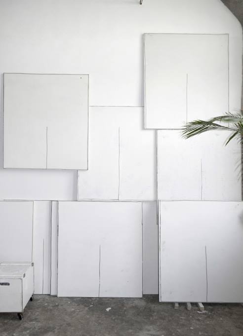 In ‘Dig,Dig,Dig’, Mahn presents an installation of nearly three dozen paintings which will shift in arrangement over the course of the exhibition. Inspired by the idiosyncrasies of repetition, each canvas contains a parallel motif: a single black line traversing the center of a chalky-white ground. Though each canvas is unique, they coalesce into a larger installation that questions process and purpose amidst Comfort Station’s distinctive space and architecture.