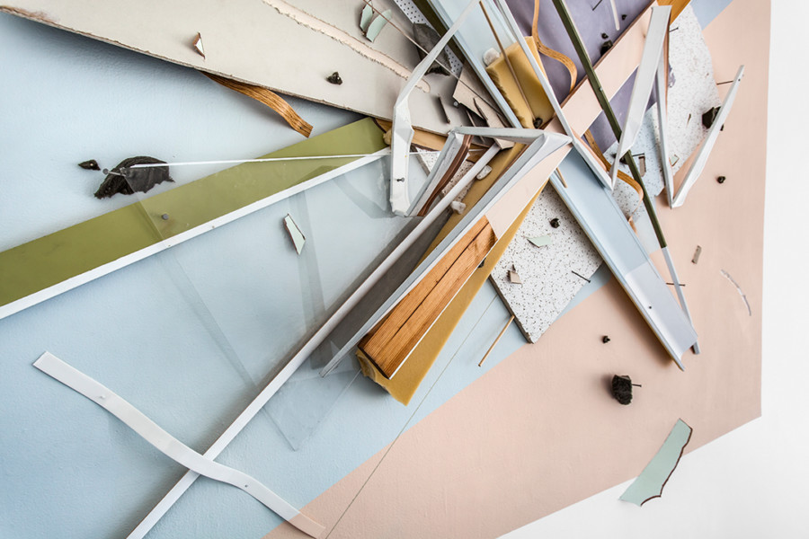 Standing Arrangement is an expansive site-specific installation by Brooklyn-based artist Katie Bell. The work explores our natural and fabricated visual landscape and deconstructs the tradition and language of painting. Bell collects objects and ready-made materials from the place in which she is producing the work, in this case, Bloomington-Normal and the surrounding vicinity. Her careful selection of discarded (and occasionally purchased) materials—wood, paint, foam board, rope, cabinets, drywall, and even forgotten hot tubs—become marks in Bell’s dynamic compositions. KT Hawbaker of the Chicago Tribune wrote that “Bell’s sculptural paintings are the product of creative recycling…inventing new uses for the detritus she scavenges and then deftly mixing in subdued deliberate colors.” Some objects jut out from the wall, shattering the picture plane, while other three-dimensional elements are scattered on the floor, interrupting the regular flow of the space. Bell acknowledges that “these objects/materials become the language and the vocabulary for the standing arrangement,” the quote from which the exhibition’s title was derived. While the act of painting is used predominantly to visually connect the objects, Bell’s background in painting plays a significant role in the aesthetics and conversation surrounding her work.
