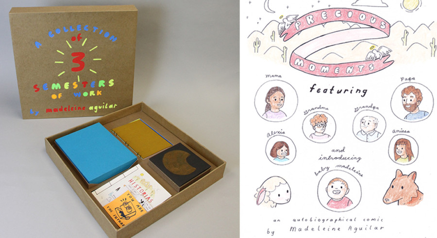 Image Credit: Left: ‘A Collection of 3 Semesters of Work,’ 2017, handmade box and books. Right: ‘Precious Moments’ (cover), 2018, pen and colored pencil on paper.