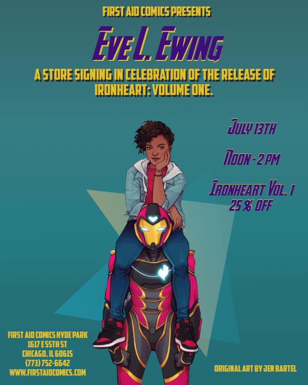 Acclaimed writer, poet and rising comic book scribe, Eve L. Ewing returns to First Aid Comics with the release of Ironheart: Vol. 1. From noon to 2 pm, Eve will be in the building signing her book with you all as we share the Riri love.