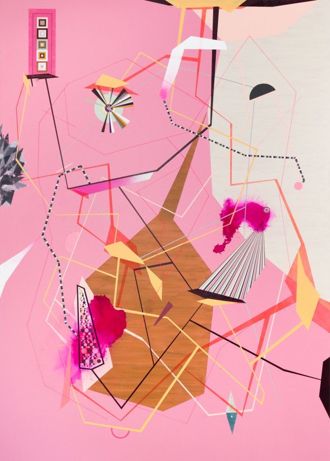 Within and across the paintings themselves segmented lines, chunks of solid color, repetitive patterns and the occasional dissolution of medium combine with Tegeder’s repeated signature motifs to create a complex host of imageries. These abstract paintings hint at a variety of concepts related to architecture, art historical narratives, Bauhausian ideologies and social constructs. The paintings coupled with their respective poetic titles allude to an amalgamation of concepts from beehives to topographical utopian maps. Through this assembly of forms and ideas, the paintings, and the painted wall they rest on, ultimately dictate a narrative for the viewer, asking them to discern the most plausible role that painting-as-medium plays in their lives.