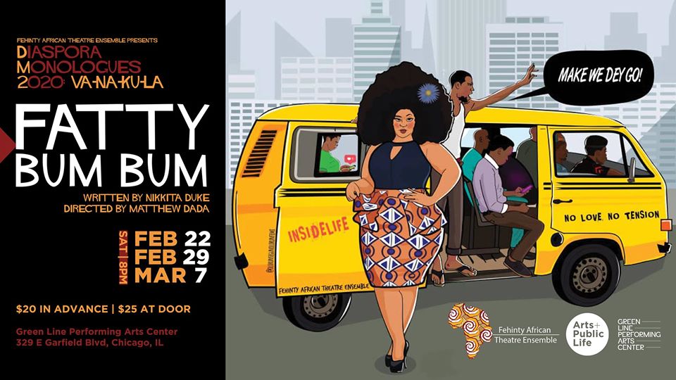 A new play by Nikkita Duke written in Nigerian pidgin, Fatty Bum Bum is a social commentary on marginalization and self-preservation as Emediong, a young woman ridiculed because of her weight, is forced to stand up for herself when her usual bus conductor insists on charging her more than other riders. Directed by Matthew Dada.