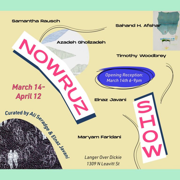 Curated by Elnaz Javani and Ali Seradge and featuring works by Azadeh Gholizadeh, Samantha Rausch, Timothy Woodbrey, Maryam Faridani, Sahand H. Afshar, and Elnaz Javani, this show highlights the commonalities of Spring celebrations between American and Iranian cultures while highlighting contemporary art practices of Chicago based artists from both regions. This exhibition aims to enchant, inspire, and open the door to the spring season. To that end, Langer Over Dickie will also be preparing a New Year’s feast for the opening to be served on custom made ceramics.