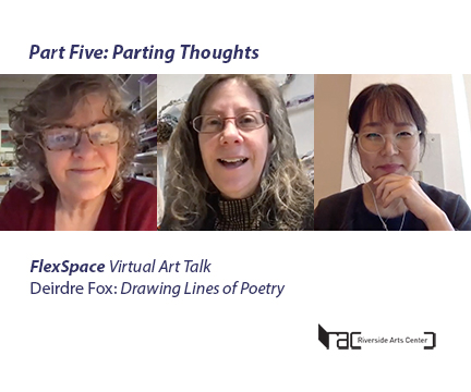 Just a few days left to see Deirdre Fox’s installation “Drawing Lines of Poetry” at Riverside Arts Center FlexSpace Gallery. FlexSpace opened the show just before “Stay at Home” began. We’ve extended the show’s run, and created a variety of online experiences to share the works, including a virtual artist talk with Deirdre Fox, Curator Yoonshin Park, and FlexSpace Director Liz Chilsen. Videos available on the RAC website. For the final days of the show, FlexSpace lights will be on throughout the day and night to enhance viewing and give visitors a socially-distanced opportunity to experience the work.