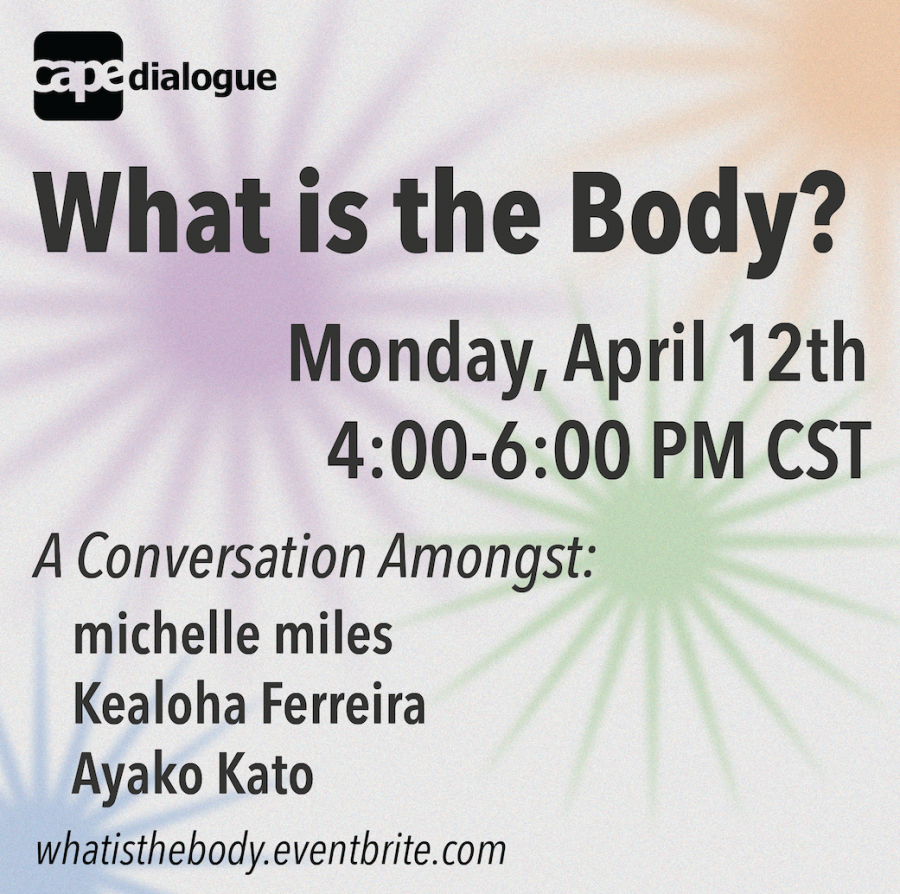 Scholars have discussed the intentional boundaries surrounding certain bodies in art: what bodies are seen, what bodies do, and what bodies can look like. CAPE Dialogue: What is the Body? aims to explore the many interdisciplinary ways in which we can center our bodies within others and our environment to reimagine equity within the arts. If art is a product of a time, place, and culture that influences how narratives are constructed, then how can we (re)envision the possible futures and imaginations that could be evoked through the exclusion or inclusion of certain bodies and relationships? This event celebrates the following panelists: multimedia artist, michelle miles; Artistic Associate and Co-Leader of Shawngram Institute for Performance & Social Justice, Kealoha Ferreira; and choreographer and artistic director of Ayako Kato/Art Union Humanscape, Ayako Kato. CAPE Dialogue: What is the Body? is hosted by CAPE Program Coordinator, AmBer Montgomery, and CAPE Research Program Coordinator, Jenny Lee.