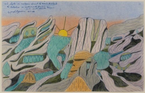 Joseph Elmer Yoakum (1891-1972) spent the last decade of his life as a prolific self-taught artist who made highly original and captivating drawn landscapes, evocations of places around the world. Created in the privacy of his home studio, Yoakum’s work was discovered by an instructor at Chicago State College, where he had his first exhibition in 1967, followed by a show at a church, both on Chicago’s south side. He landed a show at a northside gallery the following year, where faculty and students at the School of the Art Institute of Chicago received him and his work with great enthusiasm. This excitement launched Yoakum into larger and larger cultural spheres that has continued for fifty+ years.