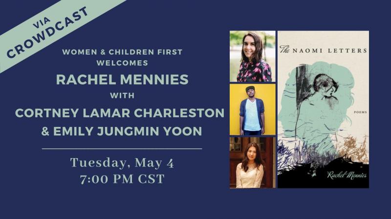 Please help us celebrate the new poetry collection The Naomi Letters  by Rachel Mennies. For this virtual event, she will be joined by poets Cortney Lamar Charleston and Emily Jungmin Yoon. Sign up via the Women & Children First Crowdcast channel!