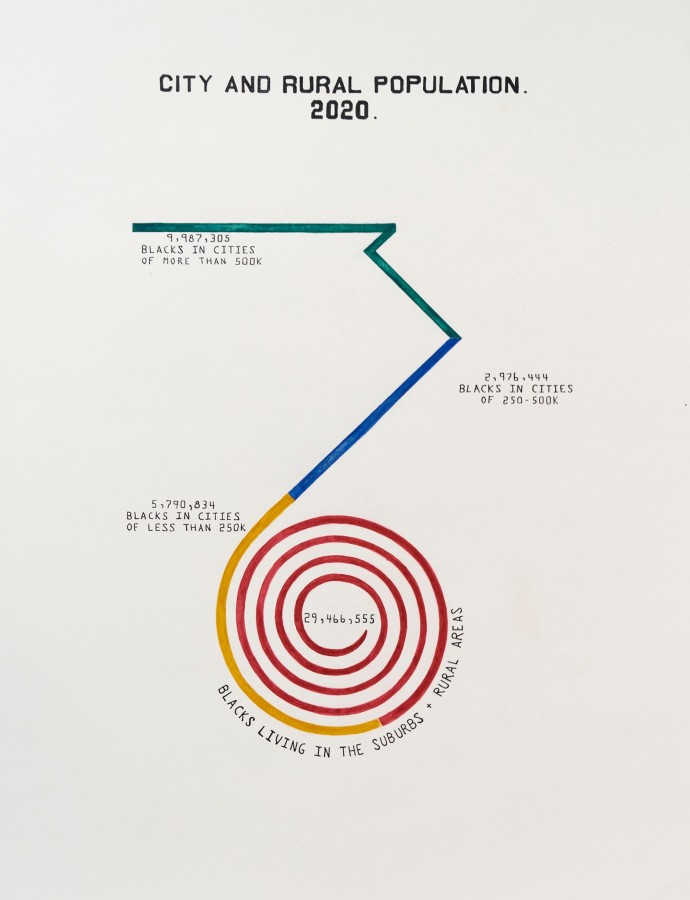 For the 1900 Exposition Universelle in Paris, W.E.B. Du Bois led the creation of a series of modernist drawings that visualized data on the state of Black life in America as a part of the Exhibit of American Negroes. In Exhibit of American Negroes, Revisited, jina valentine utilizes 2020 Census information to update Du Bois’s works with contemporary data.