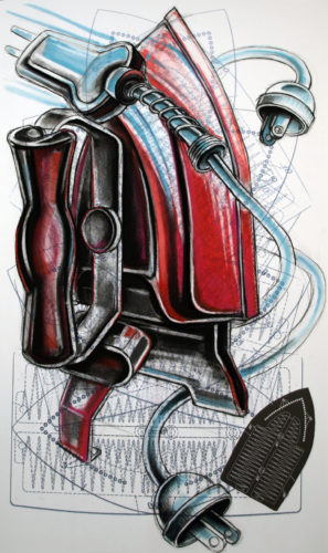 The forms I explore are inspired by vintage domestic utilitarian machines and gadgets I have collected as well as related trade catalogues, advertisements, blueprints, and patent drawings. Digital manipulations derived from these source materials lay a foundation that launches their evolution. The drawing medium allows for both transparency and mutability between layers of information. The mechanical forms within these compositions are simultaneously transformed casting off their intended function and asserting an animated physical presence and internal narrative that allows me to explore a multitude of dualities: male vs female, hand vs machine, organic vs mechanical, playful vs menacing, analog vs digital, and functional vs dysfunctional.