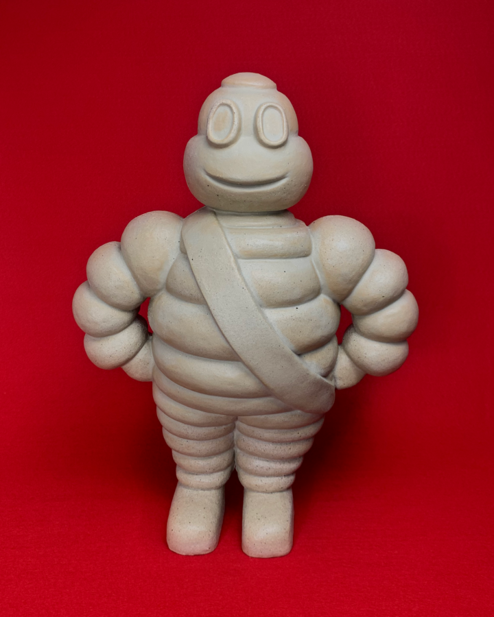 Nunc est bibendum: Now is the time to drink. Michelin’s iconic mascot attributes his name (Bibendum) to this Latin phrase and early company slogan. Bibendum exists as a relic of the commodity and industry that has monumentalized its form since 1894. Micah Sweezie brings forward the violent histories of extraction and exploitation concealed under the guise of iconography and material. The distortion of an image becomes grotesquely apparent when the toll of its depravities is scaled on its surface.