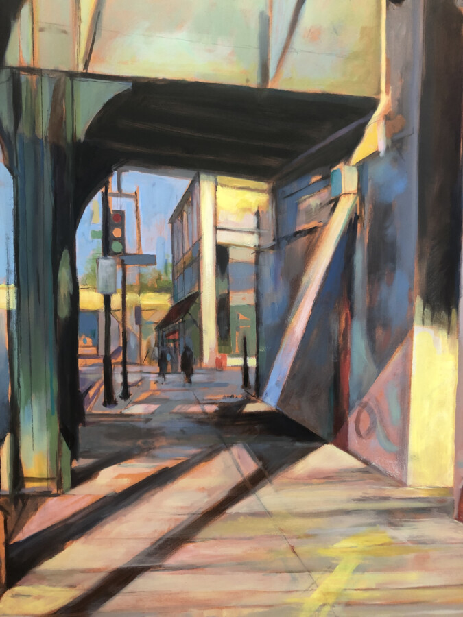 Three contemporary landscape painters (Mark Cleveland, Joseph Taylor, and Sarah Kaiser-Amaral) take us on a journey out of the everyday and into the creative mind of an artist. Viewed together, their work captures common subjects others might gloss over: the fleeting play of light as it breaks over an edge, subtle colors in reflections, and pedestrians rushing by. While each artist takes on the rough, gritty textures of underpasses, back alleys, and iconic weathered signage, they are each distinguished by their unique approach. Joe has a direct and painterly style, while Mark’s more traditional underpainting and glazing techniques are reminiscent of stained glass. Sarah’s focus is on beams of light that triumphantly break over walls covered in street art. Her light floods colorful walls filled with hard-edged geometric forms. In their combined exhibition this July at Space 900 in Evanston, they will invite viewers to slow down, pause, reflect—and take a second glance and embrace everyday scenes in urban and natural landscapes.