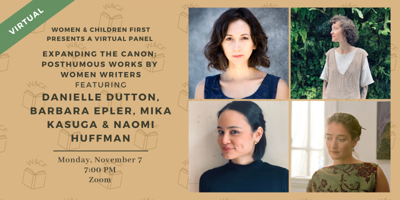 Image Description: A beige banner with the faint pattern of open books. There are four photographs of the conversation partners: Danielle Dutton, Barbara, Epler, Mika Kasuga, and Naomi Huffman. The text on the banner reads, “Women & Children Presents a virtual panel, Expanding the Canon: Posthumous Works by Women Writers with Danielle Dutton, Barbara Epler, Mika Kasuga, and Naomi Huffman, Monday, November 7th, 7pm, on Zoom.”