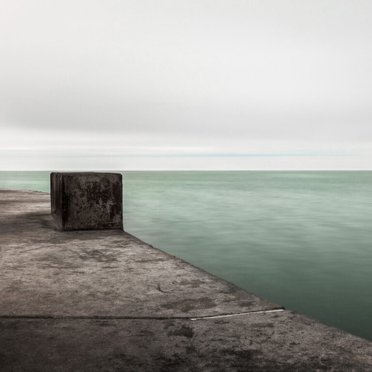 In her ongoing series, Rhythm of the Lake, photographer Tanya Lunina directs her camera at Lake Michigan in Chicago. Solitude within the open space and the various moods of the lake draw Lunina to the expanse of this body of water. Her frequent visits to the lakefront reveal a personal interpretation of a place in the city where the built environment meets the natural landscape. Water, sky, and concrete dissect each photograph into simple forms while the repetition of these elements are visual evidence of change and the passage of time.