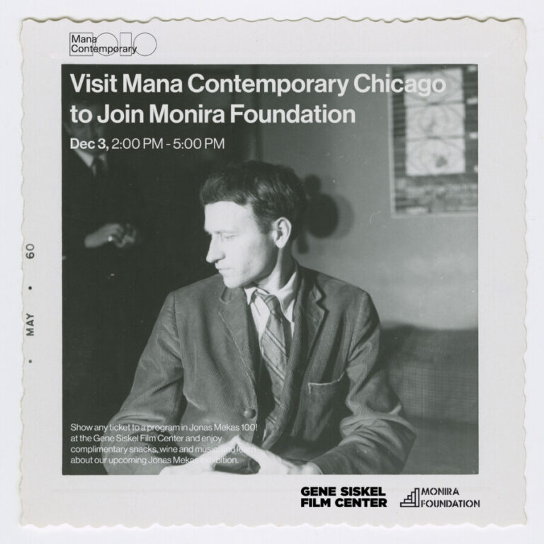 Show any ticket to a program in Jonas Mekas 100! at the Gene Siskel Film Center and enjoy complimentary snacks, wine and music, and learn about our upcoming Jonas Mekas exhibition in 2023, presented by the Monira Foundation.