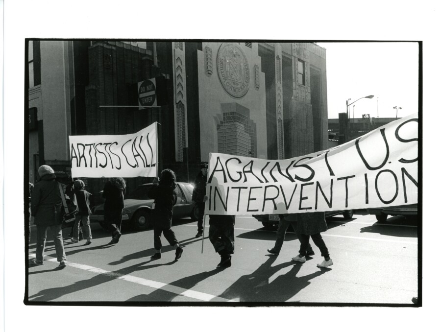 Image Info: Dona Ann McAdams, Procession for Peace with Artists Call banner, New York City, 1984. Silver gelatin print. Courtesy of the artist.