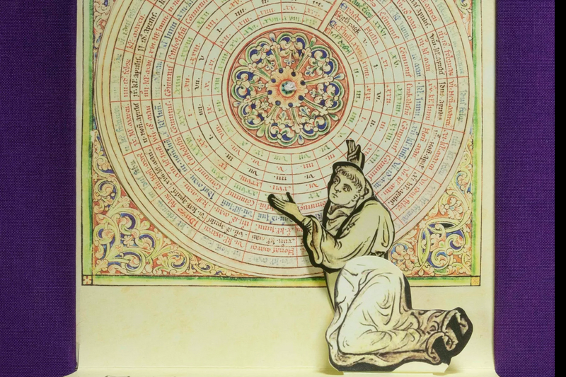 Image: Robert Sabuda’s interpretation of a spinning calendar dial by Matthew Paris from 1250. Part of “A Celebration of Pop-Up and Movable Books,” published by the Movable Book Society in 2004. Call number: Case folio Z1033.T68 C38 2004