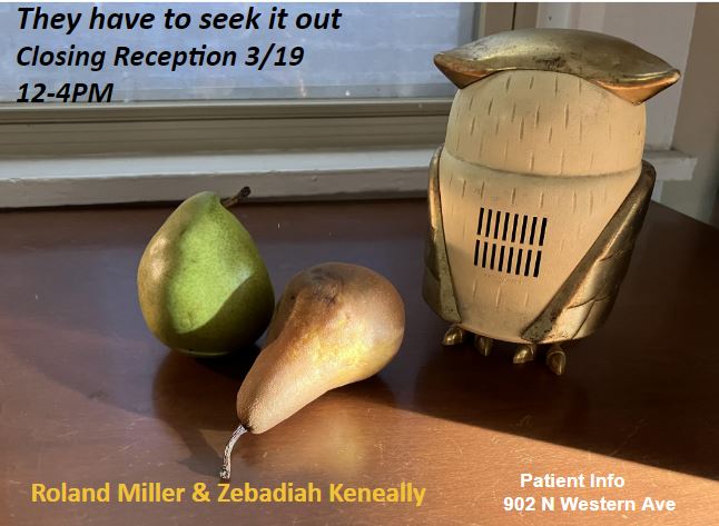 Join us for the closing reception of They have to seek it out at Patient Info on Sunday March 19th from 12-4PM to see work by Zebadiah Keneally and Roland Miller.