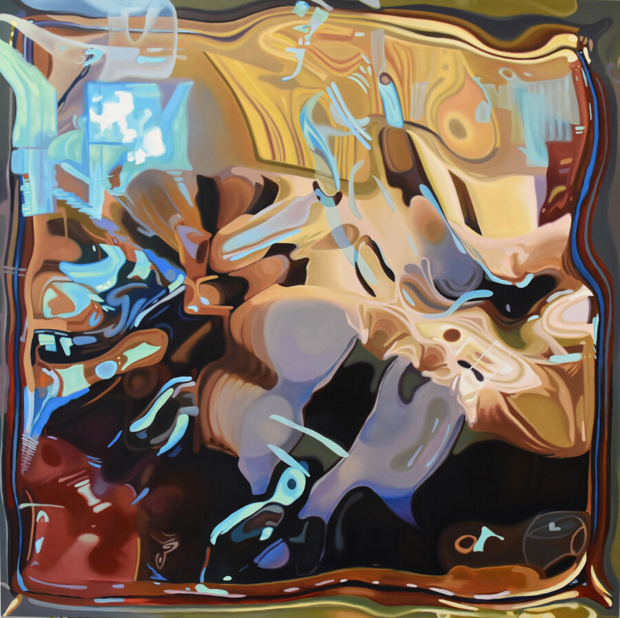 The current evolution in this series relates to the deep-rooted longing for the mountains of my youth that the depressive nature of restricted and limited social activities during the pandemic brought to the surface of my psyche. What before was a persistent quiet hum in the back of my mind became a loud and insistent reminder. Longings, in essence, become a preoccupation for the idea of an ideal but are apart from what is readily attainable. In the past two summers I took a glass block with me hiking in Montana during the summer, which inspired the kaleidoscopic altered reality seen in the Longing for the Mountains paintings. The distorted yet vibrant passages in the paintings mirror the sensation of my skewed memory of these spaces that lives and evolves, even in the mountains’ absence. The Longing for the Mountains paintings are an ongoing series and I look forward to finding the next evolution in the work.