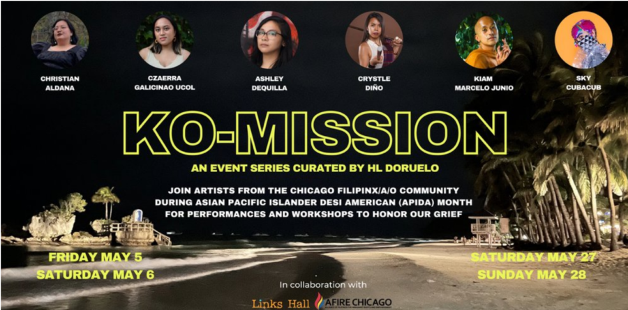 The KO-MISSION event series grounds in the truth that grief is deeply political and aims to understand its nuances and wisdom as we work together to transform harm. Each of the featured artists explore their relationship to grief, healing, care work, and their experiences as Filipinx/a/o people in diaspora rooted in Chicago. While we experience individual grief in uniquely felt ways, we recognize that we share grief that is both generational and systemic. We see grief work not only as a strategy of survival, but as a necessary part of our movements for collective liberation. KO-MISSION responds to our need for communal space to move through individual and collective grief. We invite you to join us as we dream of a kinder world and struggle towards genuine solidarity, together. Maraming salamat to the artists and AFIRE Chicago for collaborating with me and to Links HALL’s CO-MISSION Curator-in-Residence Program for supporting our vision. With love, HL Doruelo