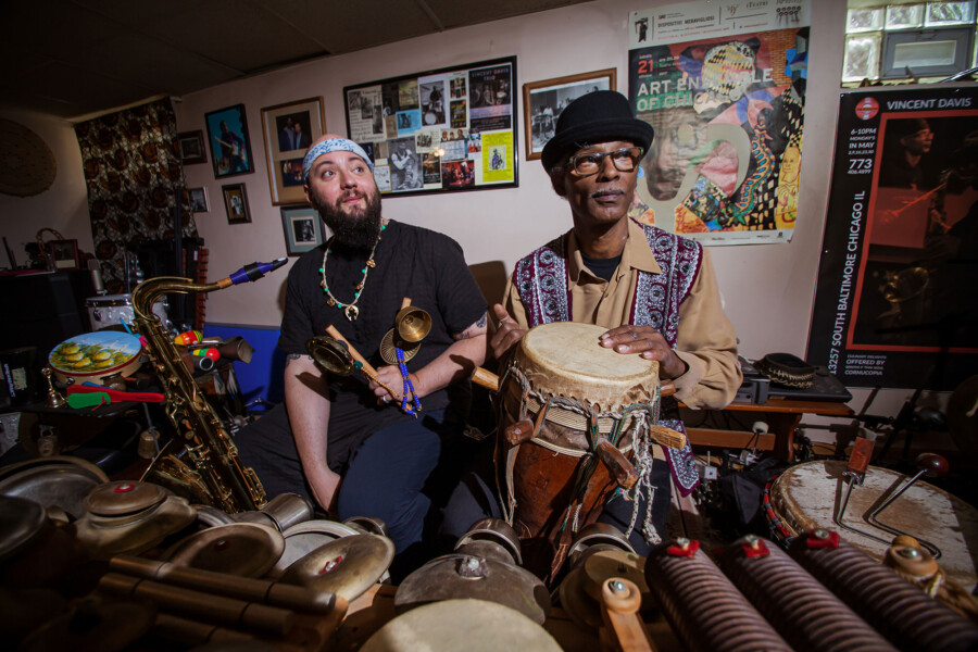Davis and Kouri will perform as part of the closing event of Temple Of at Roots & Culture on Saturday, June 3. Their shared interest in various improvisational concepts, opening musical portals into the unknown, and homemade sound makers will twist, turn and swirl into an hour-long sound exploration utilizing hand chimes, little instruments, various hand percussion, tenor saxophone, and drums. The duo presentation celebrates their weekly commitment to studying, exploring, and playing together in The Basement—Davis’s home base rehearsal and study space for many important Chicago-based jazz musicians over the past two decades.